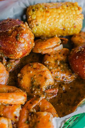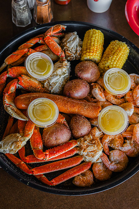 Served with 2 corn, 4 potatoes, 2 link sausage & 2 Cajun eggs